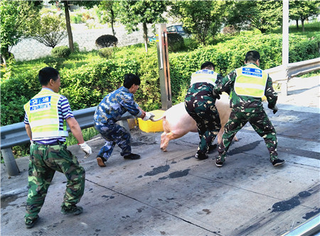 面對(duì)突發(fā)的緊急情況,駕駛員一時(shí)束手無策,當(dāng)班副班長(zhǎng)立即向值班領(lǐng)導(dǎo)匯報(bào),請(qǐng)求增援。為了防止這頭豬給過往車輛造成安全通行威脅,收費(fèi)所工作人員及時(shí)關(guān)閉了7號(hào)車道,此時(shí)的“二師兄”不讓人靠近,大家只好形成一個(gè)包圍圈,不讓它竄到其他車道去。幾分鐘后,增援的高速執(zhí)勤隊(duì)員趕到現(xiàn)場(chǎng),大家七手八腳,終于將這頭豬扛著,送回到了小貨車上。執(zhí)勤隊(duì)員說,這輛車上的一頭豬剛剛還在黃土嶺隧道內(nèi)跳出來一次。