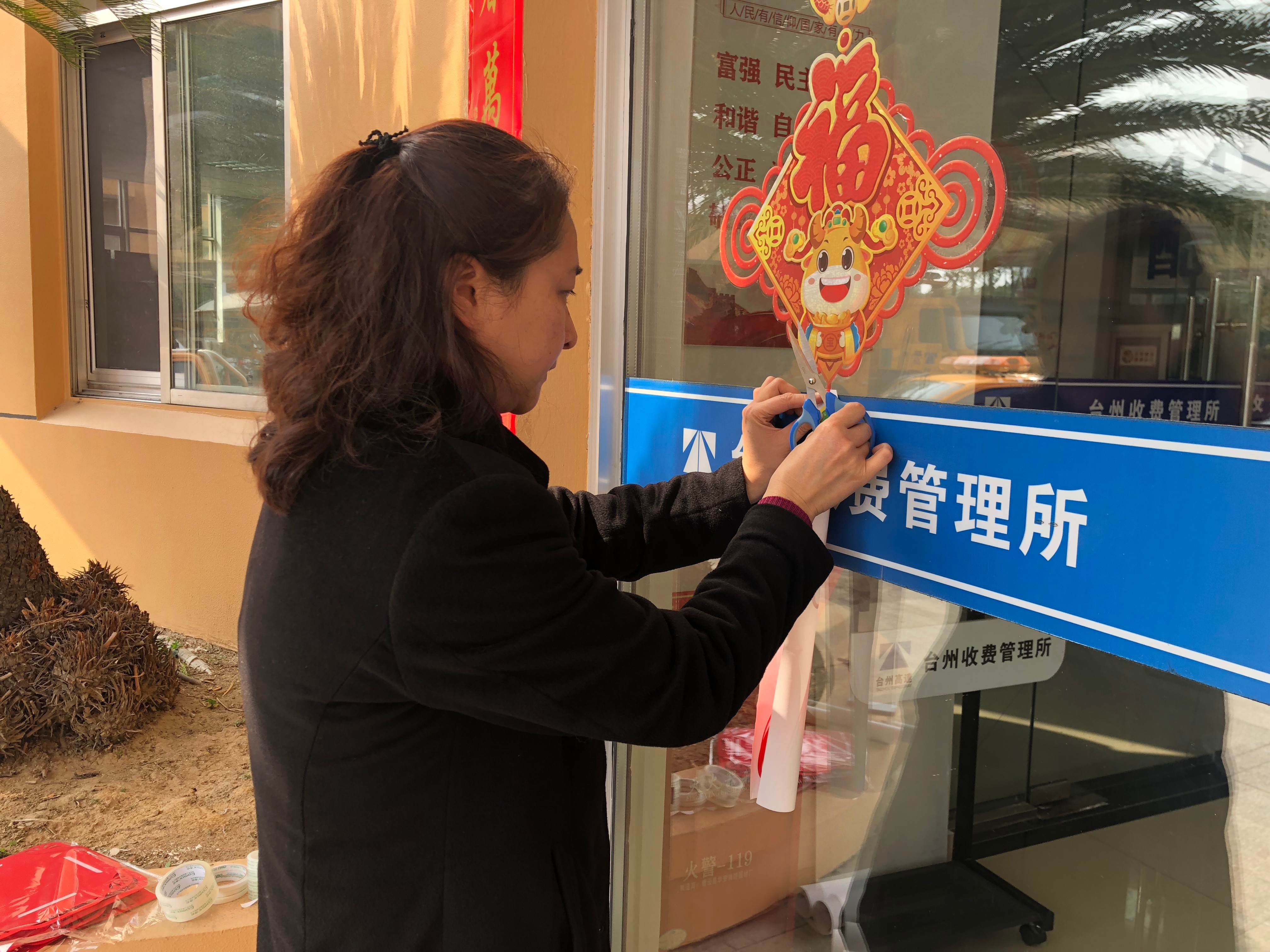 感受年味,喜迎新春 2月7日,臺州收費所員工給站所添點“味兒”。大家分工合作掛燈籠、貼對聯(lián)、貼窗花、插彩旗……一盞盞大紅燈籠高高掛起,一幅幅新春對聯(lián)溫暖門房,一張張精致窗花鑲嵌窗上,一面面五彩旗幟舞動廣場,整個收費所充滿了新年的味道,溫馨祥和。