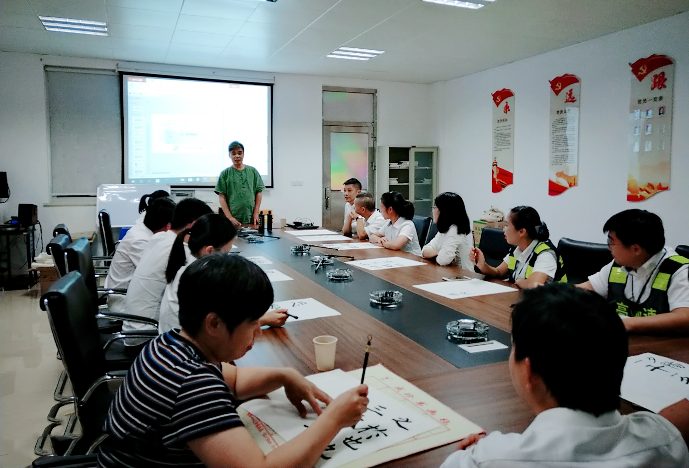 圖為培訓現場 本次培訓內容主要針對書法作品注意要點展開。課堂上,陳士春以風趣灑脫、通俗易懂的授課方式,對書法作品注意要點進行深入講解,并在白板上、紙上進行書寫演示,詳細地講解漢字的起筆與收筆,筆畫之間的搭配,同時手把手指導學員們書寫的技巧和注意事項,與大家互動交流,為大家在學習書法過程中遇到的困難答疑解惑。陳士春鼓勵大家堅持每天練習,書法一定要持之以恒,