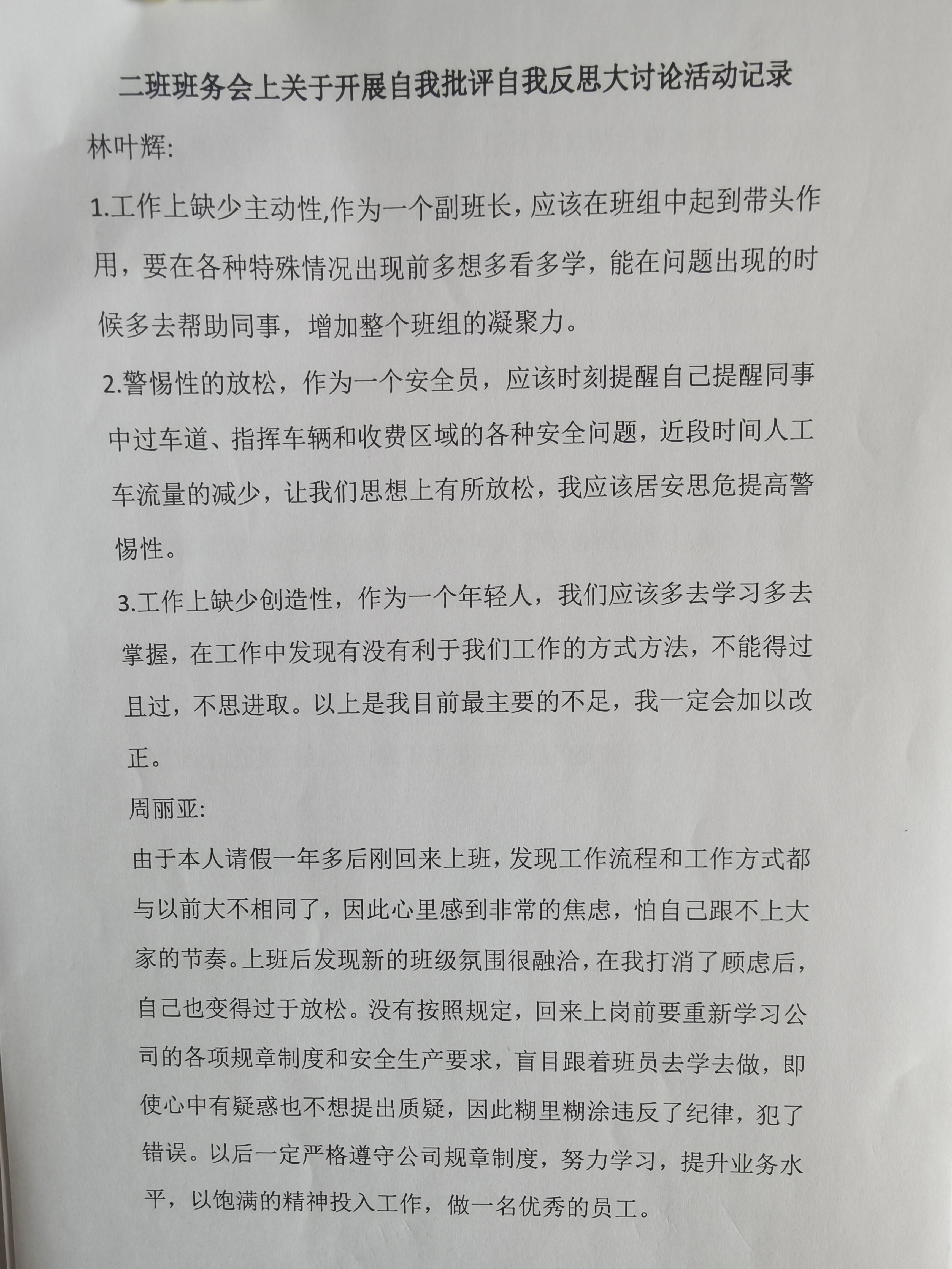 (圖為員工自我批評)
