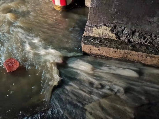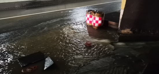 圖為車道水流 當晚19:12分,黃土嶺隧道所中控員徐彤霞發現寧向隧道主車道路面出現積水,如不及時處置,路面濕滑會讓過往車輛打滑,嚴重影響隧道的安全暢通。為了杜絕安全隱患,管理所立即啟動防汛應急方案,中控員第一時間在管理群發送現場圖片,并在同一時間通知執勤隊與監控中心。 執勤隊員不顧狂風暴雨趕赴現場,19:19分,斜井現場山上倒灌入隧道的水嘩嘩直流,儲水池水流急促,執勤隊員立即分工合作,一組在主車道擺放安全錐采取防護措施,并利用沙包,堵住排水溝壁,使水盡量不往外滲,及時避免了積水對隧道內行車造成的安全隱患。一組檢查潛水泵是否正常運行,查看積水入侵的原因、排水溝通暢情況。