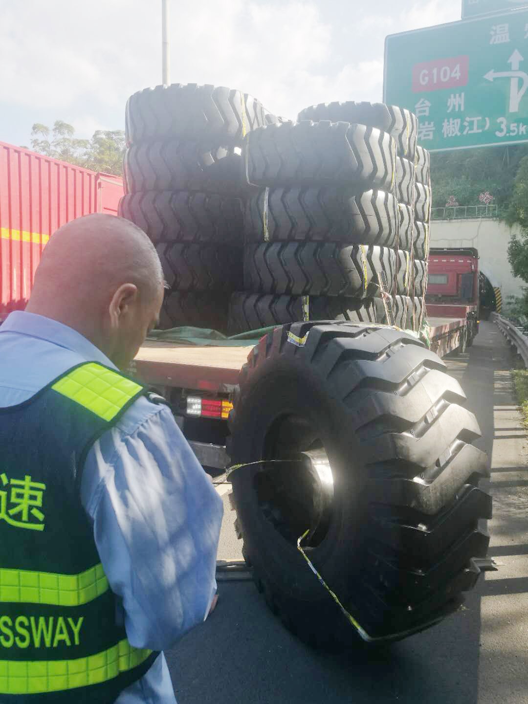 執(zhí)勤隊接警后立即趕往事故地點,一輛運載輪胎的貨車??吭谥鬈嚨溃渲幸粋€巨型輪胎滑落到硬路肩上,致使后方車輛紛紛避讓。為及時消除險情,執(zhí)勤隊快速在現(xiàn)場做好安全警戒工作,同時將現(xiàn)場情況反饋給監(jiān)控中心。由于貨車綁繩索松動,重達300多斤的輪胎脫落在地,隨后執(zhí)勤隊協(xié)同施救中心、駕駛?cè)?/span>員合力將掉落的輪胎先拖至車旁,經(jīng)過長達半個小時的搶險,跌落的貨物終于完好無缺地回到貨車上,道路恢復(fù)暢通。 筆者溫馨提醒:在高速公路行駛過程中,駕駛?cè)藨?yīng)注意將車上的貨物固定好,途中要隨時注意貨物及捆綁繩索是否松動。無論是車輛撒落物還是人為拋灑物,都會給道路安全暢通埋下了重大隱患! 林玲