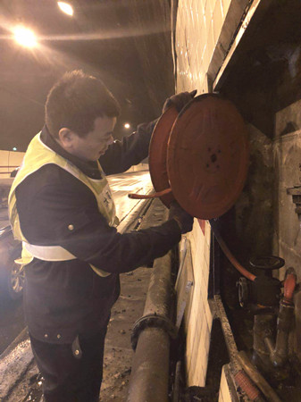 圖為檢查人員在檢查消防卷盤 大溪嶺隧道所負責人向來客介紹,隧道清洗工作需集團下屬的施救中心、維養(yǎng)中心、隧道所員工,以及外協(xié)單位、養(yǎng)護公司等人員的積極配合,分工合作,將利用兩天時間完成大溪嶺雙向隧道的清洗維修任務。張金財再次稱贊表示,控制隧道清洗時間能有效地緩解地方交通壓力、節(jié)能減排。 2018年度春運即將開始,各方檢查人員借此次隧道清洗機會,全面排查影響隧道暢通的安全隱患,做好隧道內設備設施的維修保養(yǎng)工作,為創(chuàng)造平安節(jié)日提供保障。 陳智慧