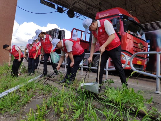 圖為志愿者合影 活動現場,身著紅馬甲的志愿者們,拿著垃圾夾、垃圾袋、掃把、畚斗等工具,重點清理收費站內外廣場的煙頭和白色垃圾。由于上下高速時有不少司乘人員直接把垃圾丟向兩側邊溝,導致收費所兩側邊溝垃圾較多。盡管天氣炎熱,但志愿者們自行分組,三人一組、五人一隊,充分發揮不怕苦不怕累不怕臟的精神,并互相配合集中對一些死角進行清理。