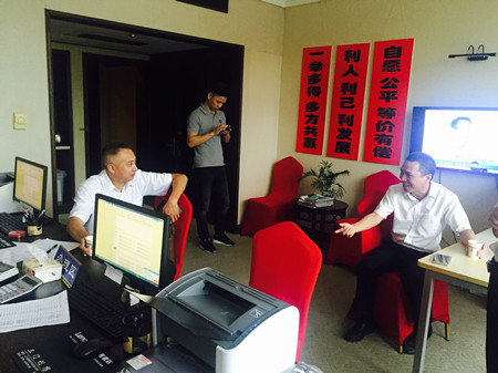 圖為集團(tuán)副董事長(zhǎng)、總經(jīng)理張建平在天臺(tái)收購(gòu)點(diǎn)詳細(xì)詢(xún)問(wèn)收購(gòu)工作具體開(kāi)展情況 張建平向各地方政府前期對(duì)公司股權(quán)收購(gòu)工作的支持表示感謝,他介紹了當(dāng)?shù)嘏_(tái)州高速股權(quán)收購(gòu)進(jìn)展情況,同時(shí)闡明收購(gòu)工作中存在的困難,需要地方政府繼續(xù)對(duì)我們的工作給予支持和幫助。三地政府都表示一定會(huì)全力支持這項(xiàng)工作。仙居縣分管公司股權(quán)收購(gòu)的常務(wù)副縣長(zhǎng)說(shuō),“放心吧,我們一起想辦法,先從持股較多的法人股入手,再化大力氣做小股東工作,一定會(huì)圓滿完成任務(wù)。” 張建平一行先后來(lái)到三地股權(quán)收購(gòu)點(diǎn),向收購(gòu)一線的工作人員表示親切的問(wèn)候。張建平對(duì)大家的工作給予肯定,感謝所有人勤勤懇懇,無(wú)私付出,并希望大家繼續(xù)努力,共同實(shí)現(xiàn)目標(biāo)。工作人員詳細(xì)介紹了日常具體工作方法,他們緊跟公司股權(quán)收購(gòu)總體布局,并結(jié)合當(dāng)?shù)靥厥馇闆r,因地制宜,有序靈活地開(kāi)展股權(quán)收購(gòu)工作。