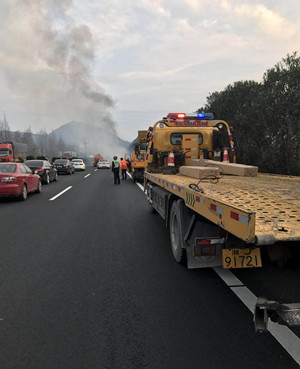 事態(tài)緊急,刻不容緩,清障車立即拉響警報(bào)預(yù)警,迅速提速超過事故車,指引該車轉(zhuǎn)入應(yīng)急車道避免二次事故。由于該車運(yùn)載易燃品,天氣晴好,火勢(shì)借東風(fēng)迅速變猛,無法直接現(xiàn)場(chǎng)救援,事故車駕駛員已經(jīng)手忙腳亂。施救中心工作人員立即緊急上報(bào)指揮中心請(qǐng)求消防車支援。中心“2+1+n” 快速應(yīng)急模式隨即馬上啟動(dòng),17:30分在中心待命的施救車也到達(dá)現(xiàn)場(chǎng)配合預(yù)警,保持事故現(xiàn)場(chǎng)另一車道暢通,不影響其他車輛安全通行。 17:40分消防車到達(dá)現(xiàn)場(chǎng)滅火,18:15火滅,清障車帶事故車離開現(xiàn)場(chǎng)。從發(fā)現(xiàn)到處置完畢僅1小時(shí),無人員傷亡,高速公路也一直保持安全暢通。 童軍偉