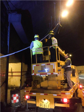 圖為施工人員維修電纜 當天早上8時左右,交警開始組織實施封道搶修。作業期間,大溪嶺隧道所堅守在北洞口卡口預警,維養中心班員和專業搶修人員對橋架、掛落的電纜和被撞的攝像頭進行了應急處理與臨時加固。此時,過往車輛已堵到大溪收費所,這時候,時間就是速度,速度就是通車效率。