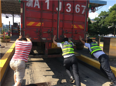 6月19日15時左右,一輛杭州牌照的大貨車,在進入臨海南收費所三車道時突然熄火拋錨,司機嘗試了幾次無法啟動,立刻下車檢查車況。 “師傅,怎么了?有什么能幫您?”收費員徐海源見此情景,立即上前熱心詢問。 “哎!包在油箱口的塑料紙怎么就掉進油箱內,現在車子怎么都發不動不了。”司機有點發急地回答。 “師傅,別著急,我先找幾個同事幫您把車推出車道。”收費員趕緊安慰司機焦急心情。 “好的,那謝謝你們。”司機連忙點著頭。為了避免車道堵車,徐海源立刻利用對講機向當班班長周萍說明情況,周萍立刻關閉該車道,啟動備用車道。此時此刻,收費員李俊杰、楊旭佳毫不猶豫的趕了過來與駕駛員一起推動車子。“一、二、三,一、二、三,使勁呀……”可是車子仍然紋絲不動。怎么辦?請求支援!正準備下班的行政人員陳瑩、劉華萍得知情況后,二話不說飛奔到車道,加入到推車行列中。用力推呀——哎,不行;再來一次——還不行。面對23.97噸的大貨車,大家仍是束手無策。“去找根鐵棒試試!有道是給你一根鐵棒,我能翹起整個地球。”不知是誰大喊了一聲。“行,可以試試,快去找”話音剛落李俊杰快步跑向所內,尋找鐵棒。不一會兒,只見他興奮地高舉鐵棒沖著大家喊道:“找到了!找到了!”
