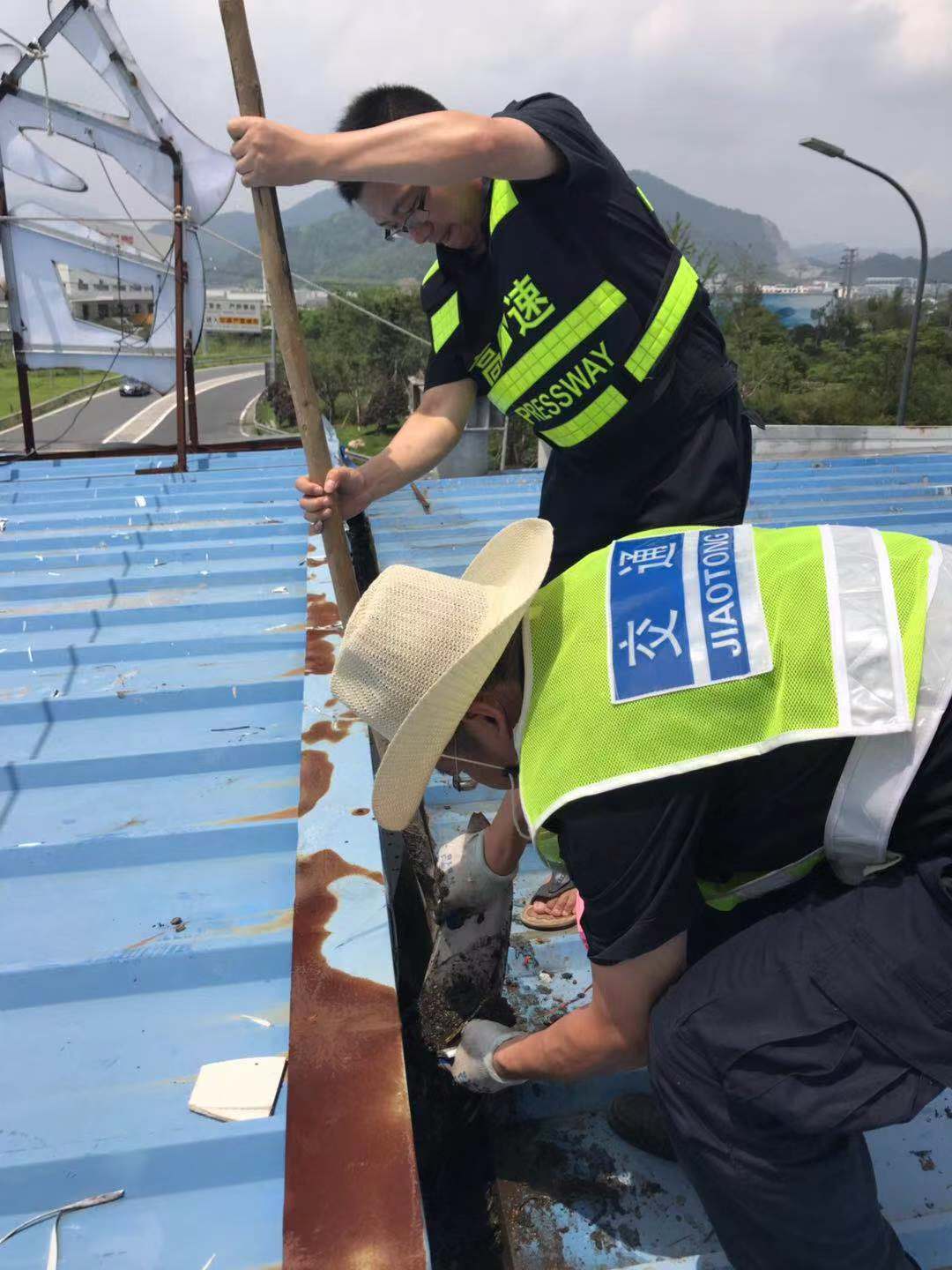 全面清除收費(fèi)頂棚及下水管道垃圾。集團(tuán)沿線收費(fèi)頂棚經(jīng)過(guò)幾次的施工裝修,遺留了一些裝飾垃圾,如不及時(shí)清理一旦掉入排水溝或下水管道,勢(shì)必會(huì)造成頂棚漏水,影響下面人員及設(shè)備安全。8月7日,維養(yǎng)中心組織班員在登高車協(xié)助下,頂著炎炎烈日,利用垃圾夾、鐵鍬等工具對(duì)沿線收費(fèi)站收費(fèi)頂棚上方垃圾、排水溝中的淤泥進(jìn)行了逐一清理,并重新鋪設(shè)排水溝上面的防護(hù)網(wǎng),防止臺(tái)風(fēng)期間吹來(lái)的一些塑料紙袋等輕型垃圾再次堵塞下水道。