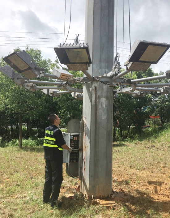及時(shí)下降各收費(fèi)所互通區(qū)高桿燈。為提升互通區(qū)照明亮度,減少因選錯(cuò)路口而帶來(lái)的不必要的麻煩,集團(tuán)在各收費(fèi)站出入口互通區(qū)共安裝了11盞40米高度高桿燈,每盞高桿燈上方有12盞鈉燈。倘若這些高桿燈上鈉燈在臺(tái)風(fēng)襲擊下一旦掉落后果將不勘設(shè)想。8月8日,中心再次召集各班人員對(duì)收費(fèi)沿線高桿燈進(jìn)行了下降處理。因高桿燈四周雜草叢生,在下降時(shí)維修隊(duì)員不僅要忍受底下蚊蟲肆意叮咬,還要克服時(shí)而烈日時(shí)而大雨的怪異天氣,沒(méi)放幾盞隊(duì)員便濕透了全身,衣服是濕了又干,干了再濕。