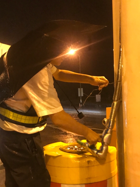8月9日21點(diǎn)22分,風(fēng)雨越來(lái)越大,臨海南收費(fèi)所車(chē)道水管被狂風(fēng)吹得隨意搖晃,當(dāng)班收費(fèi)員李俊杰不顧狂風(fēng)暴雨,第一時(shí)間拿上鐵絲冒雨捆綁,防止砸到過(guò)往車(chē)輛,保證了車(chē)道安全暢通。