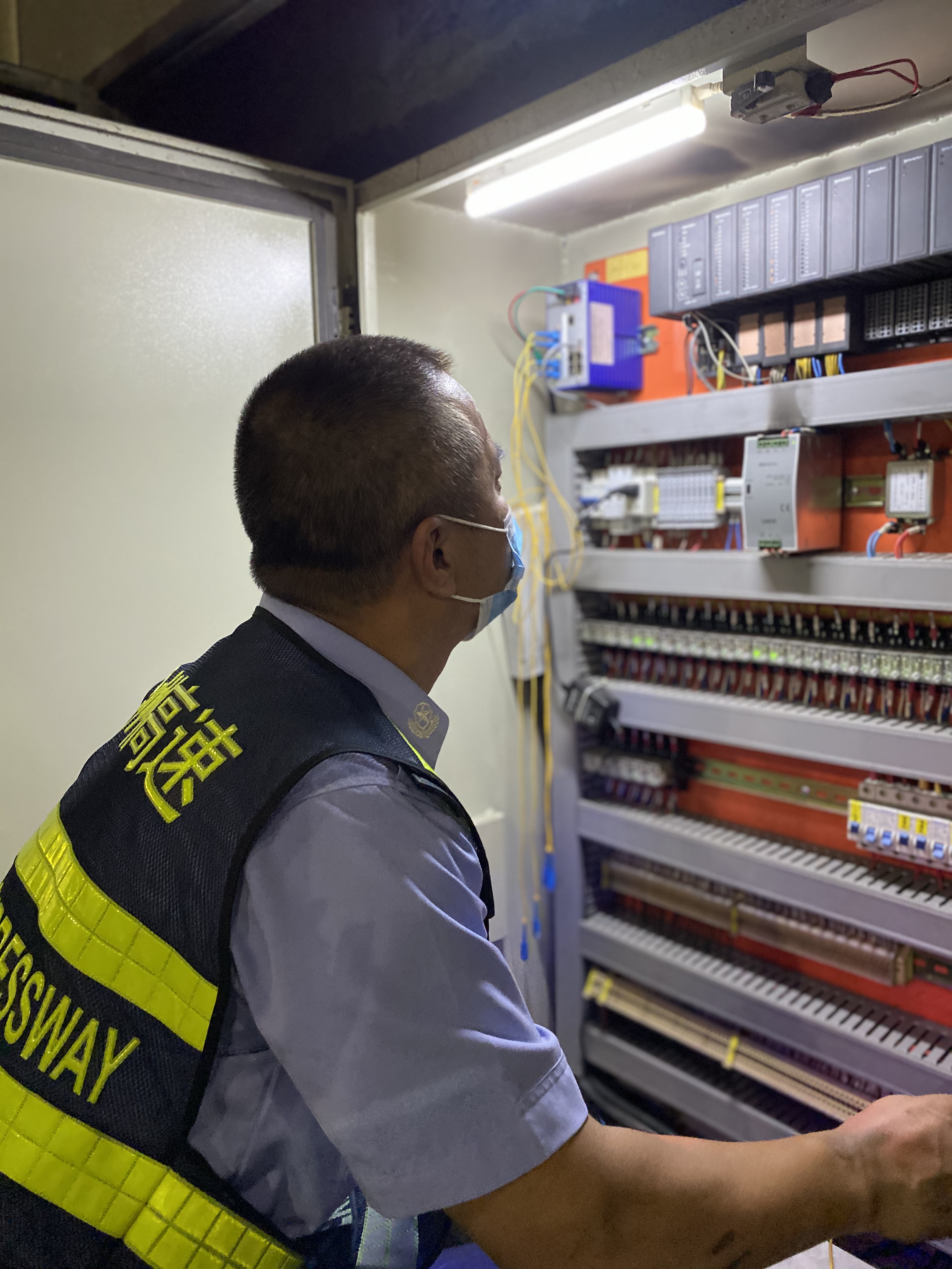 雖然隧道內沒有烈日的灼燒,但日均4萬的車流,加上尾氣排放,導致隧道內的氣溫遠高于室外。當室外37°C時,整個隧道里宛如一個蒸籠。盡管如此,廣場上、電纜溝上隨時都有執勤隊員忙碌的身影。他們來回徒步穿梭于隧道,檢查指示燈、消防設備箱、緊急電話、火災報警等設施設備,排查各類安全隱患,修復受損設備,處理各種突發情況。一趟下來臉和胳膊被熏得黝黑,口罩、衣服濕了又干、干了又濕,盡管工作量大、強度高,他們從不喊苦說累。