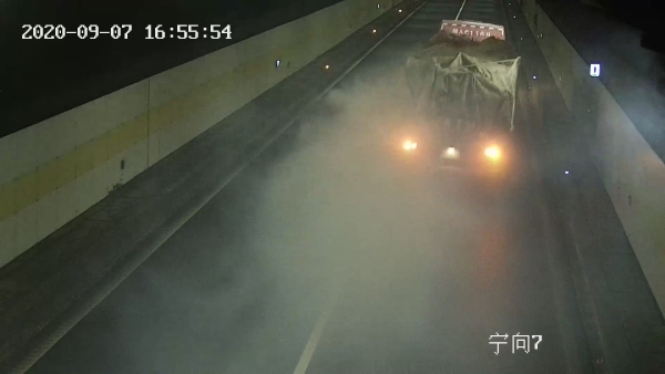 9月7日下午16點(diǎn)53分,一輛大貨車駛?cè)雽幭螯S土嶺隧道,打著雙閃燈,整車發(fā)散出濃濃的煙霧,造成隧道內(nèi)能見(jiàn)度極低。