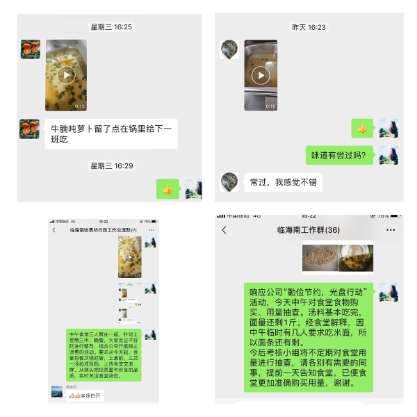 臨海南收費所不只是單單把宣傳標語掛在墻上,擺在桌上。更把節(jié)約舉措落實到具體行動中。為了不浪費食材,行政人員提前安排一周菜單,并統(tǒng)計用餐人數(shù),規(guī)劃食材數(shù)量,食堂工作人員按照人數(shù)采購當天食材控制成本,并將每餐燒好的菜拍成視頻上傳食堂交流群,以更好地關(guān)注食堂動態(tài),從源頭把控菜量與伙食的品質(zhì),每周還不定期抽查食堂,查看剩余量。