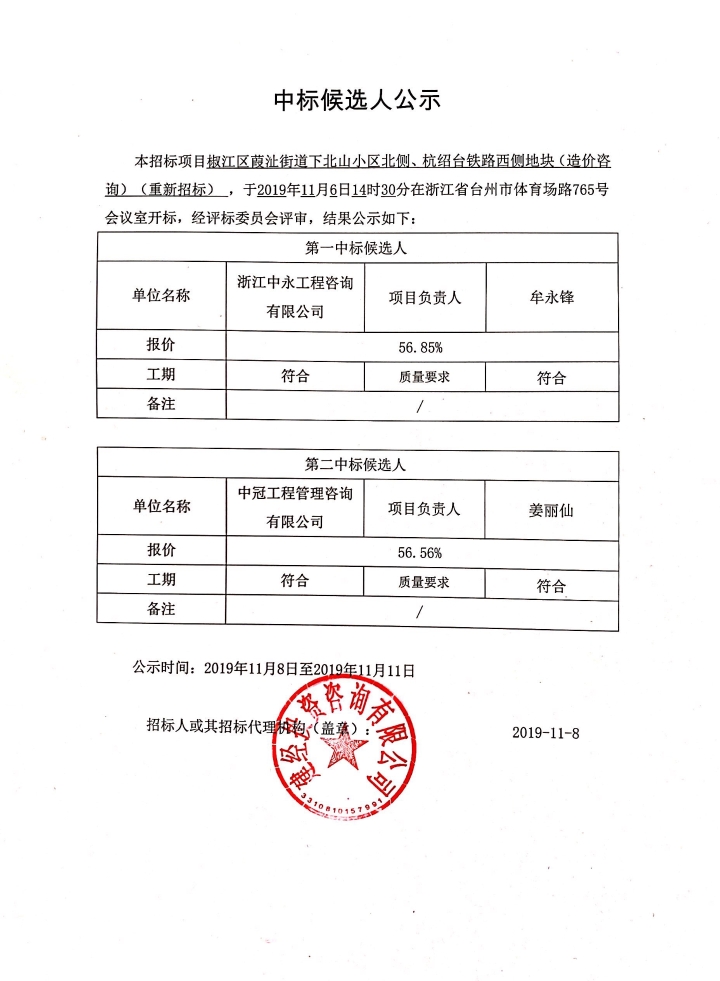 椒江區(qū)葭沚街道下北山小區(qū)北側(cè)、杭紹臺鐵路西側(cè)地塊(造價咨詢)中標(biāo)候選人公示