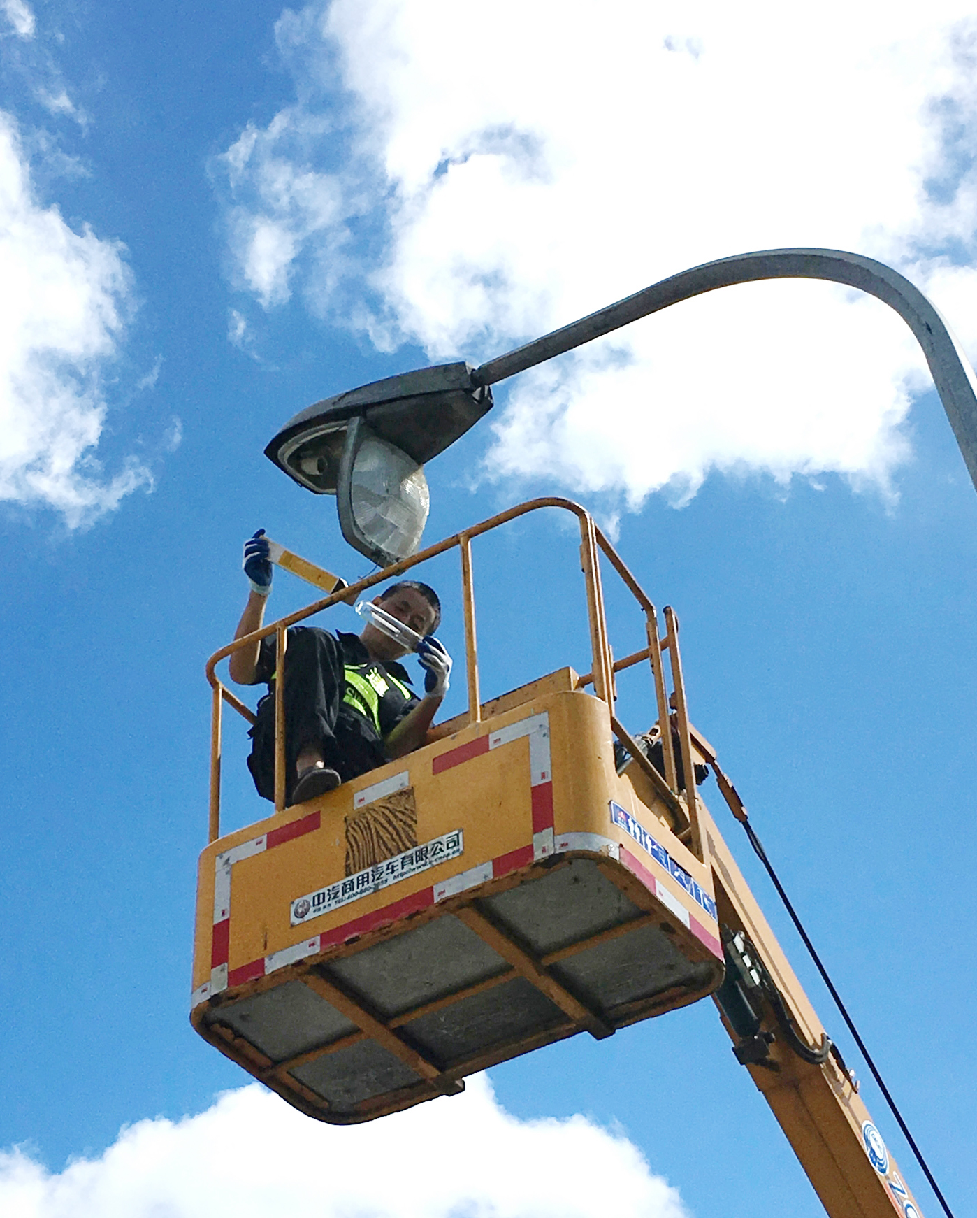 圖為張鵬在登高車上維修廣場(chǎng)路燈