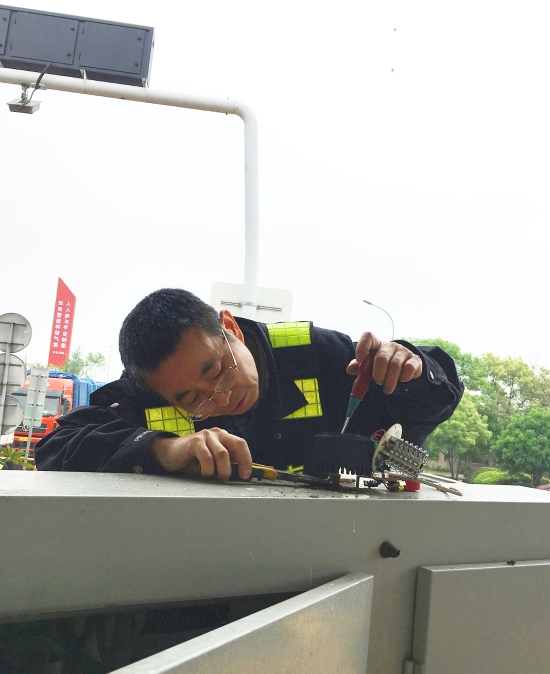 歲月滄桑,時(shí)光荏苒,如今張鵬兩鬢已顯斑白,眼睛也有些老花,但依然精神抖擻,干勁十足。8月12日,臺(tái)風(fēng)過后的臺(tái)州南收費(fèi)所內(nèi)廣場(chǎng)有兩盞路燈同時(shí)失效。當(dāng)?shù)歉哕囘^來的時(shí)候,盡管當(dāng)時(shí)他因痛風(fēng)雙腳腫大還沒完全消退,但仍第一個(gè)跳上去維修,站在狹小車兜里佝僂著身子,戴著老花鏡更換各種設(shè)備。8月的烈日炎炎似火燒,沒過一會(huì)豆大的汗珠從他額頭上淌下透濕了全身。