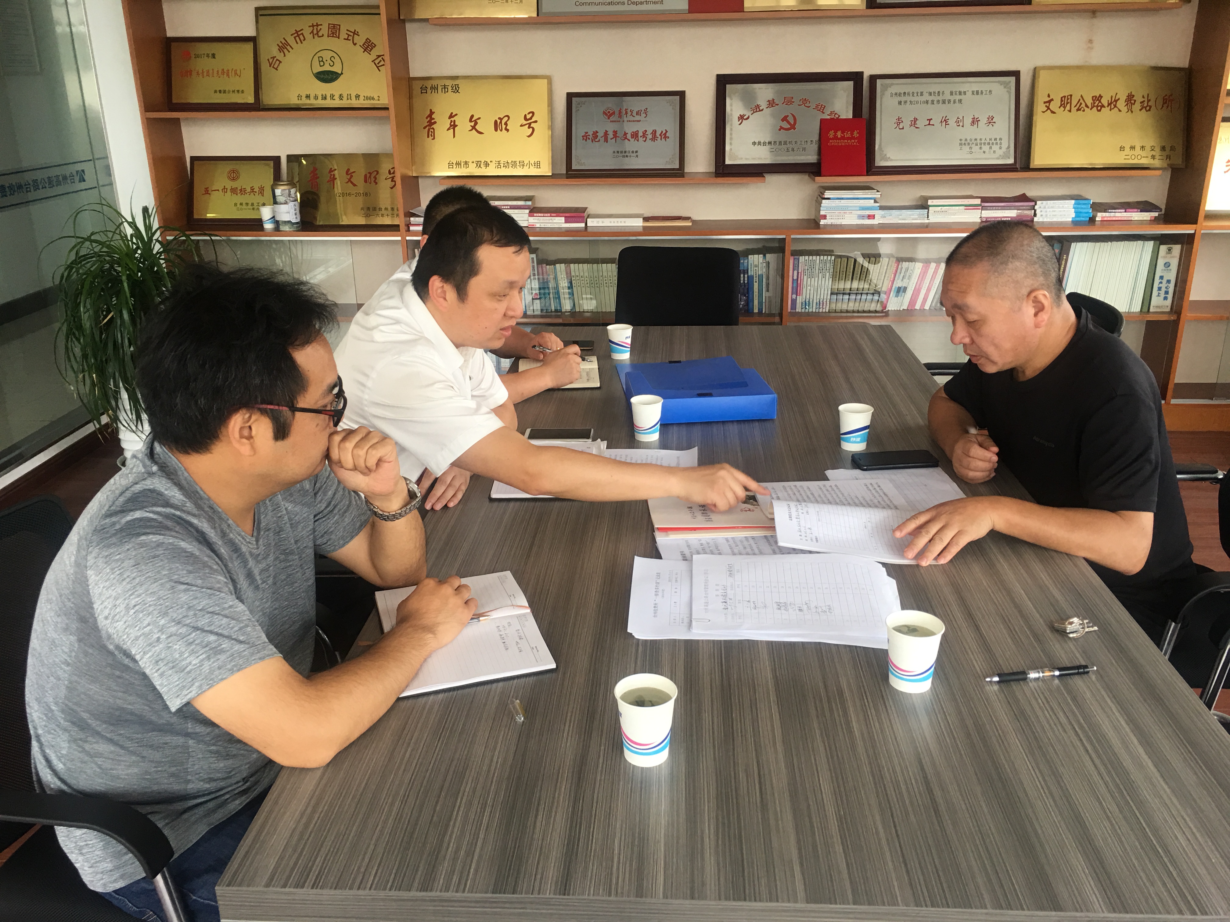圖為檢查組在臺州收費所檢查 本次檢查以年初簽訂的《黨風廉政建設責任書》和新出臺的《集團公司黨風廉政建設責任制檢查考核辦法》為依據,以廉政教育開展頻率及支部書記上廉政黨課完成情況為重點,通過聽取責任人工作情況介紹、翻閱相關工作臺帳資料等形式,查證黨風廉政建設責任實際落實情況。