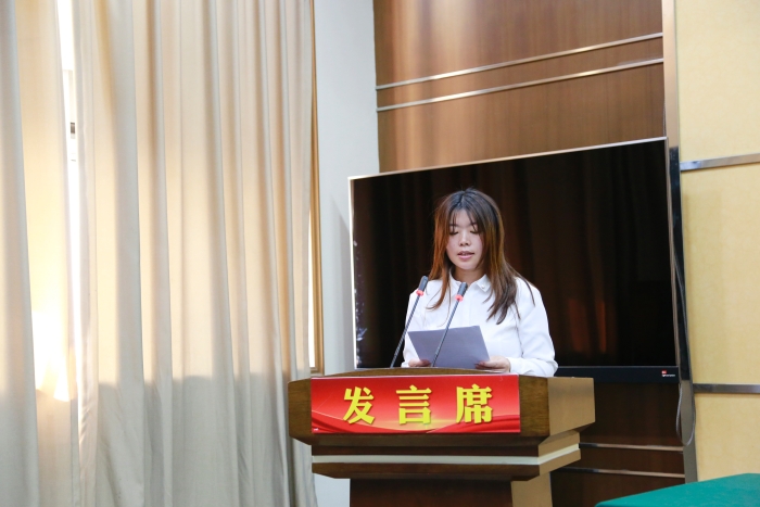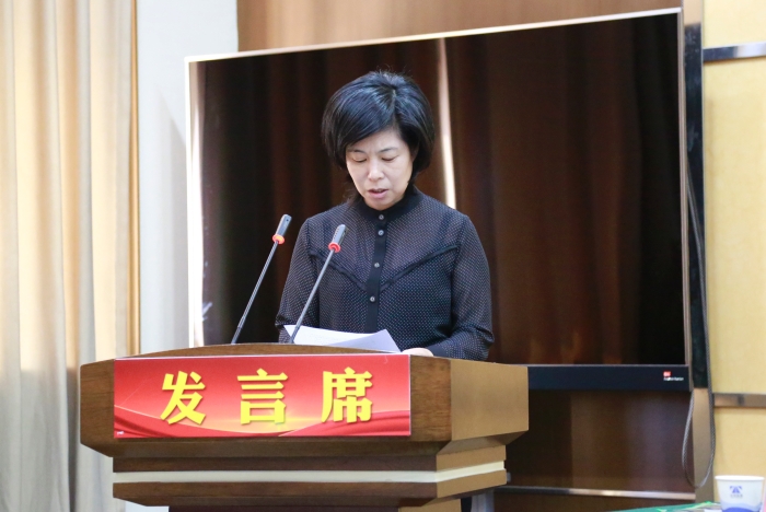 圖為曾莉莉作工作報告 隨后,臺州高速集團召開第七屆女職工代表大會,選舉產生新一屆女職工委員會委員,曾莉莉當選為女工委主任。