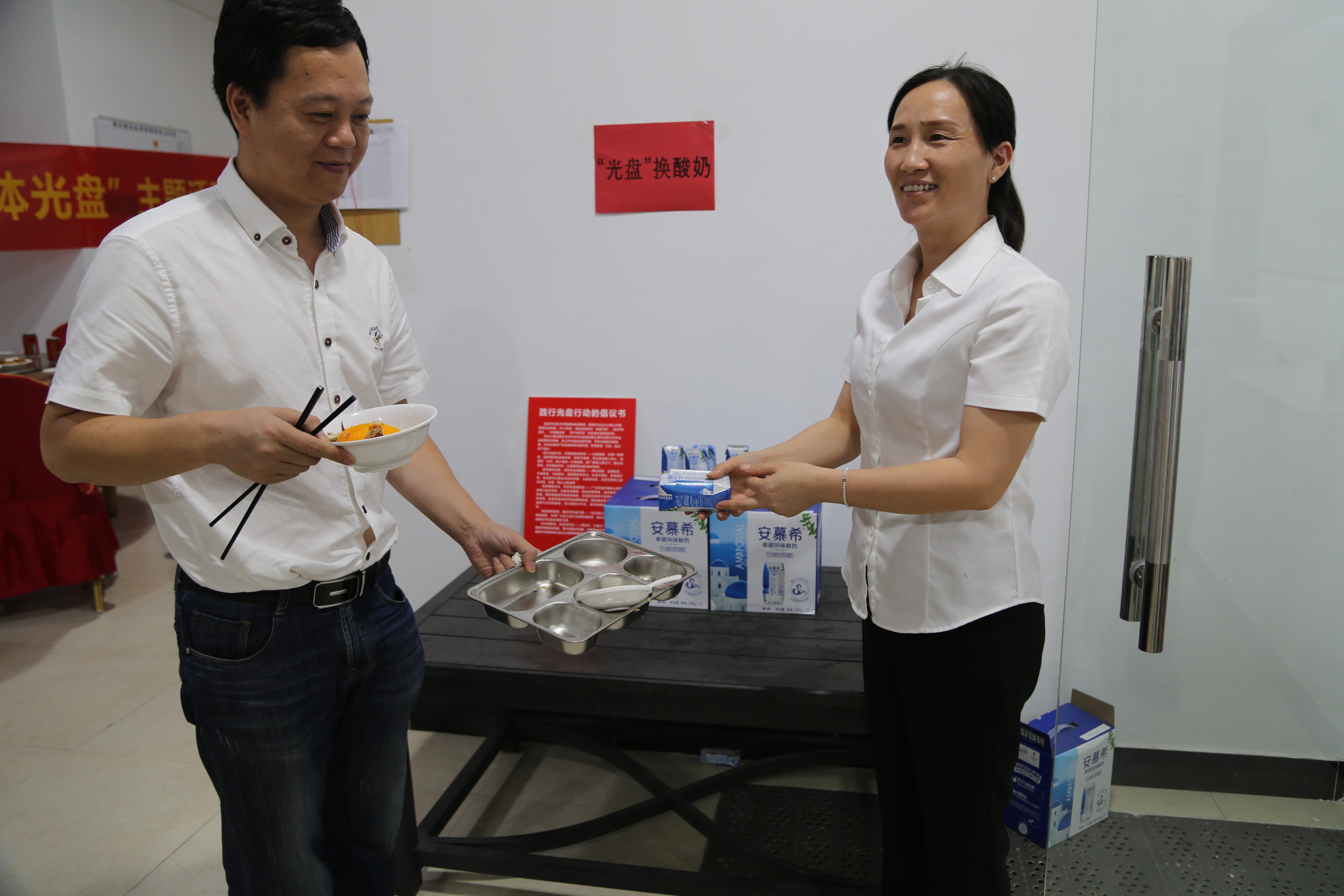 餐后,公司為倡導(dǎo)員工愛惜糧食,鼓勵(lì)員工積極光盤,實(shí)行“光盤獎(jiǎng)勵(lì)”,每一位員工憑光盤可以兌換酸奶一瓶,借此小獎(jiǎng)勵(lì),倡導(dǎo)文明新風(fēng)尚,以“光盤”為榮,以“剩宴”為恥。 盧丹麗