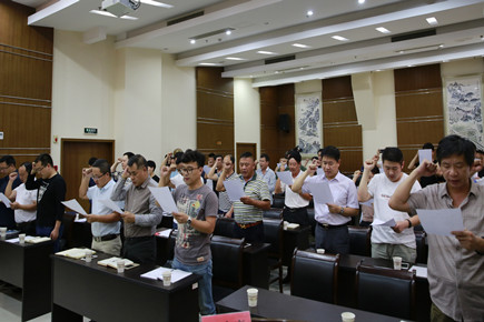 圖為參會人員集體宣讀誓詞 會上,內環路(黃巖段)各標段的施工單位、監理單位主要負責人根據各標段的工程推進現狀,針對2017年11月11日主線通車的目標進行了表態,承諾在最后的150天時間里,倒排工期,掛圖作戰,確保在市委市政府規定的期限前完成主線通車任務,為臺州市民交上一份滿意的答卷。 周一鳴